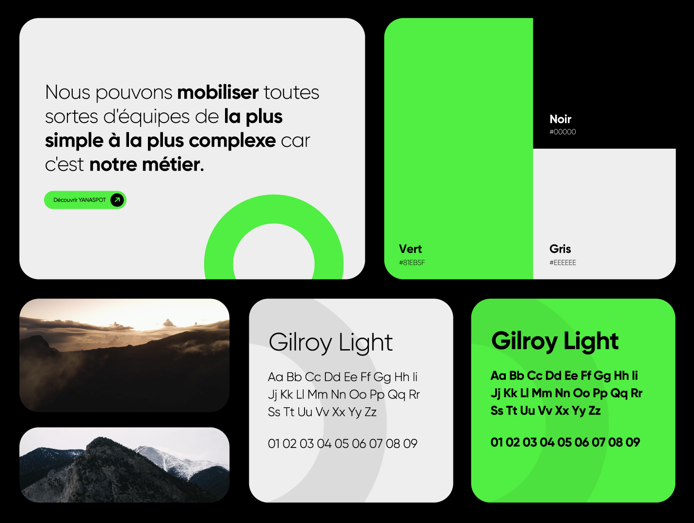 To design a unique identity, our artistic direction focused on a dominant, bold colour: neon green. This choice highlights creativity, growth and innovation, three essential elements of Yanaspot’s DNA. The colour also makes it easier to identify with the brand. To complete the palette, we’ve added a touch of elegance with black and clarity with grey.