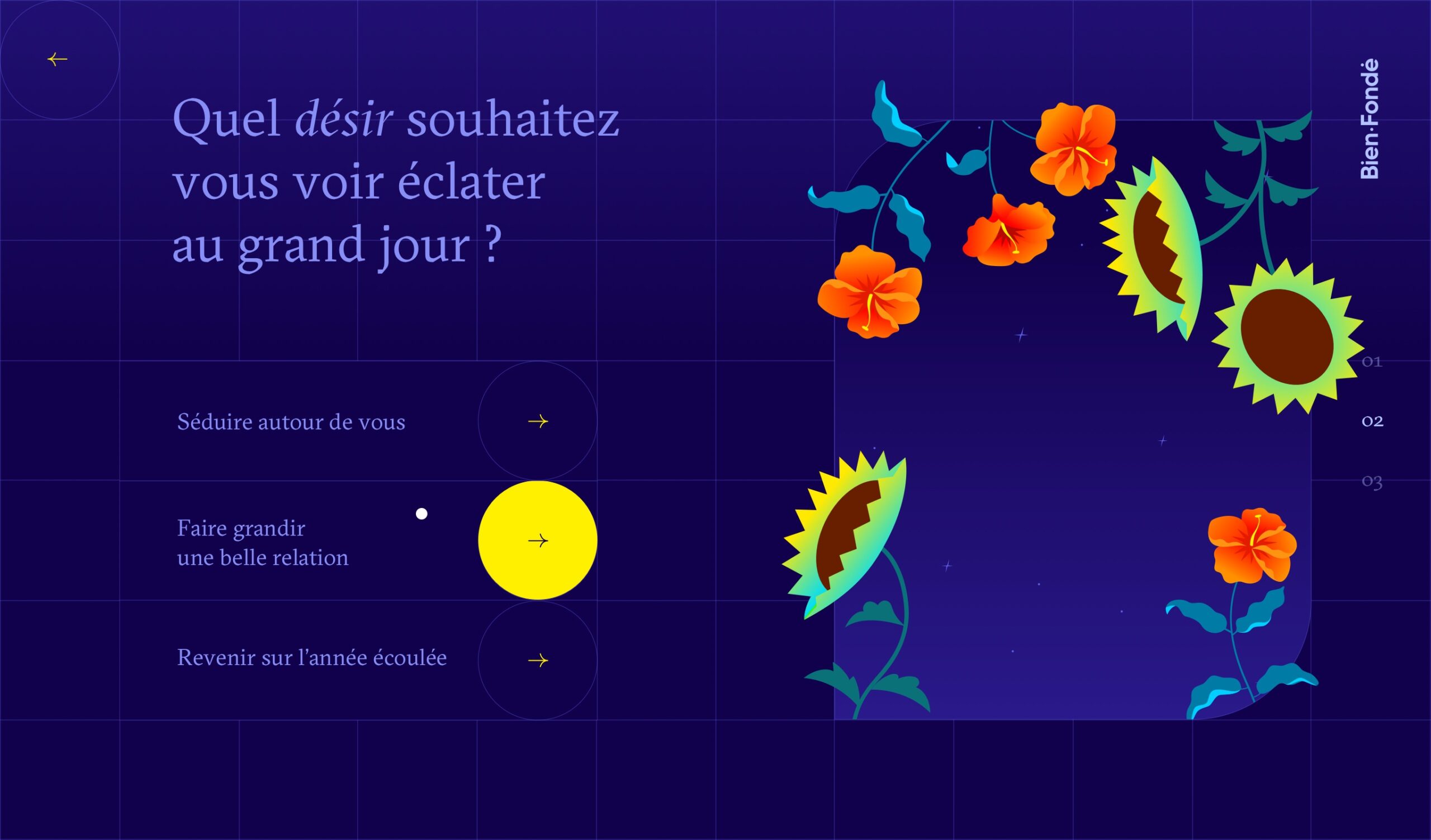 En quelques questions, l’agence invite à imaginer en ligne une composition florale qui reflète les désirs de communication de chacun pour 2022. À l’issue de l’expérience, c’est un beau bouquet qui apparaît à l’écran dont chaque type de fleurs évoque un des souhaits du visiteur et qu’il pourra partager à son réseau.